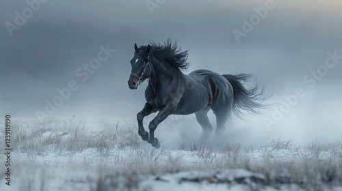 A majestic black horse gallops through a snowy landscape, surrounded by mist, creating a mystical and serene atmosphere.
