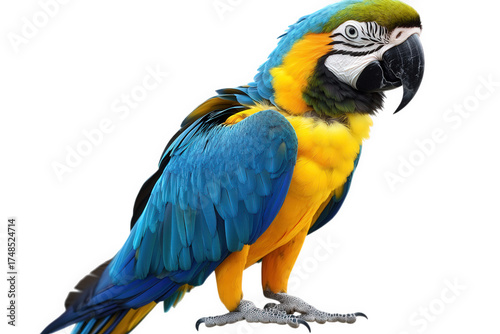 A majestic blueandyellow macaw perches gracefully, isolated on transparent background, its vibrant plumage and sharp features highlighted against the stark backdrop