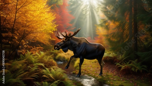 a majestic bull moose standing in a stream within a vibrant autumn forest setting