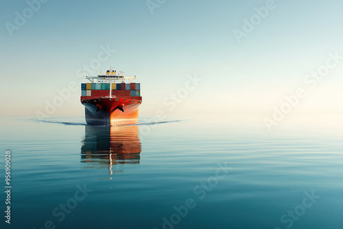cargo ship, container ship, ocean, sea, water, blue, calm, tranquil, serene, sky, gradient, light blue, white, sailing, navigation, maritime, transportation, logistic, industry, commerce, travel, journey, movement, peaceful, solitude, minimalist, simple, photo, image, visual, aesthetic, horizon, distant, immensity, nature, environment