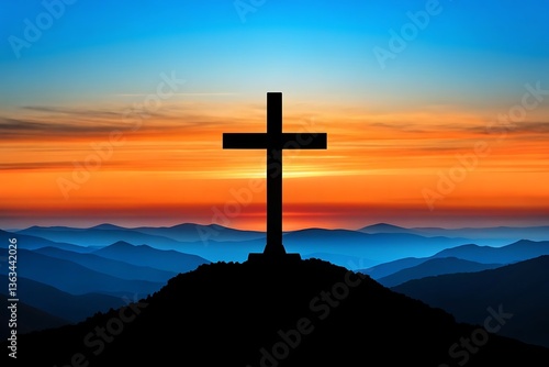 A majestic cross silhouetted against a vibrant sunset over rolling mountains, a symbol of hope and faith in a breathtaking landscape.