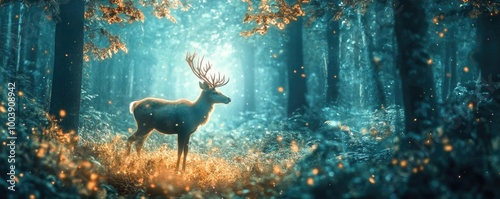 A majestic deer stands in a serene forest, bathed in ethereal light, surrounded by soft greenery and magical ambiance.