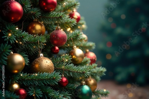 A majestic fir tree with a garland of colorful ornaments wrapped around its trunk, Fir trees, festive atmosphere