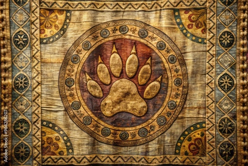 "A majestic lion's footprint mars the ancient banner, with intricate patterns and symbols worn away by time and the elements."