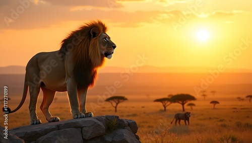 A majestic male lion stands on a rock at sunset, overseeing its kingdom in the vast, golden African savanna.