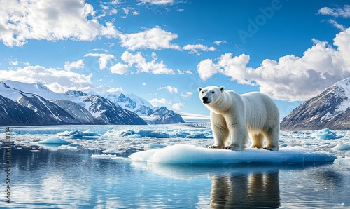 A majestic polar bear stands on an ice floe in the Arctic Ocean, surrounded by mountains and a blue sky.
