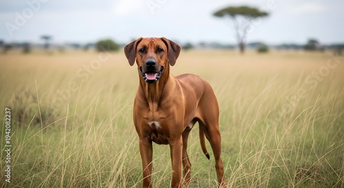 A majestic Ridgeback dog stands proudly in a vast savannah, embodying the spirit of the African wilderness, its gaze intense, its presence a picture of strength.