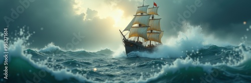 ship, sailing, ocean, wave, storm, adventure, maritime, sea, horizon, cloud, travel, exploration, nautical, vessel, sunset, nature, water, dramatic, sky, coast, journey, history, transportation, wind, sail, marin, fantasy, classic, pirate, symbol, resilience, scenic, landscape, blue, atmosphere, epic, motion, art, seascape, calmness, freedom, power