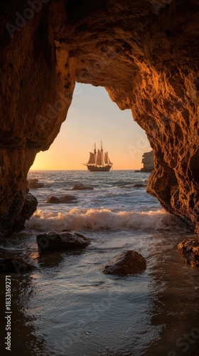 A majestic sailing ship viewed through a sea cave at sunset, waves gently lapping at the rocky shore. Golden light bathes the scene