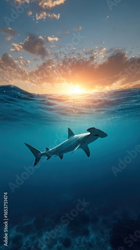 A majestic shark swims beneath the surface as the sun sets, casting a golden glow over the ocean's waves.