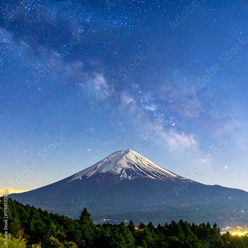 A majestic snow-capped mountain, visible at night, under a vibrant sky filled with stars and a soft, glowing galaxy band