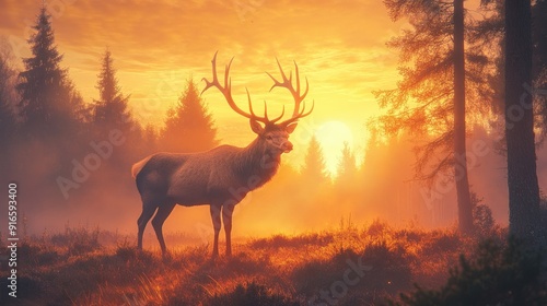 A majestic stag standing in a misty forest at dawn, with its antlers silhouetted against the rising sun.