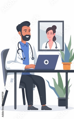 doctor, desk, laptop, consultation, video, call, female, white, coat, medicals, appointment, technology, communication, distance, health care, professional, remote, diagnosis, treatment, patient, interaction, advice, virtual, meet, clinic, field, male, teamwork, physician, conference, webcam, screen, setup, work, together, health, engagement, modern, medicine, computer, office, scrub, woman, ceremony, prescription, expertise, to sit, use