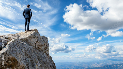 A male executive perched on a rocky cliff, gazing out at the expansive view below, signifying a leader's ability to see the bigger picture in the business world