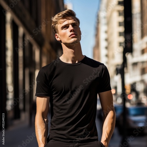 A male model wearing a black cotton t-shirt, posed casually on a city street.