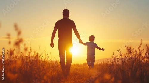 A man and a child stroll through a vibrant field, illuminated by the warm glow of a sunset, capturing a moment of connection and tranquility.