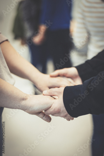 A man and a woman opposite each other hold hands. The concept of union, dialogue, confidential conversation between people.