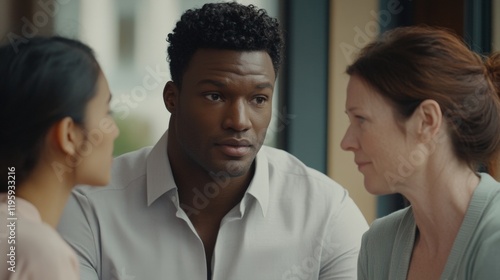 A man and two women are sitting at a table. The man is wearing a white shirt and the women are wearing pink. Scene is serious and contemplative