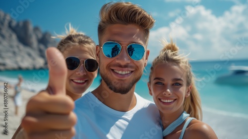 A man and two women are smiling and posing for a picture on a beach. The man is wearing sunglasses and a white shirt, while the women are wearing swimsuits. Scene is happy and carefree