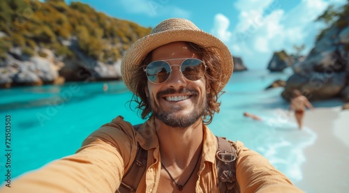 A man captures the perfect vacation moment, his sun-kissed smile shining through his stylish sun hat and sunglasses as he poses against the beautiful backdrop of a mountain and beach, water glistenin