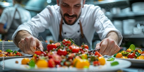 A man dressed in a chefs uniform is skillfully preparing food on a plate
