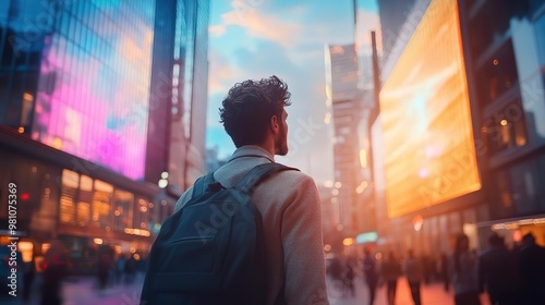 A man explores a vibrant cityscape, illuminated by colorful billboards during sunset, embodying urban life and adventure.