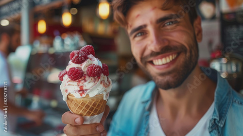 a man holding a vanilla ice cream with raspberry toppings, happy, blur background