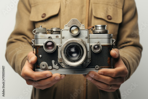A man holding a vintage camera, isolated on a white background, representing the solitude of the creative process. Generative Ai.