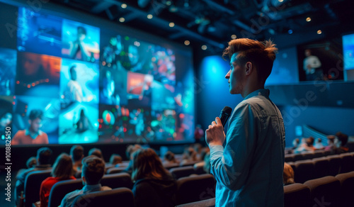 A man holds a microphone while presenting a film to an audience in a dimly lit theater, with a large screen in the background.