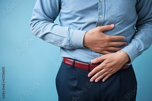 a man holds his hands on his stomach. Abdominal pain concept