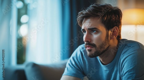 thoughtful, man, room, blue, shirt, pensive, mood, indoor, portrait, contemplative, expression, home, interior, casual attire, wear, living, emotional, depth, introspective, modern, lifestyle, evening, light, domestic, setting, solitude, personal, male, quiet, moment, relaxed, atmosphere, natural, decor, mental, health, self, lighting, cosy, serene, environment, contemporary, peaceful, private, space