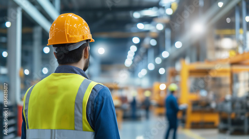 A man in a hard hat and reflective vest is observing the industrial workspace in a factory or warehouse.