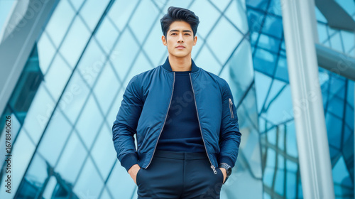 A man in a minimalist navy bomber jacket and tailored black trousers, standing confidently in front of a futuristic glass building