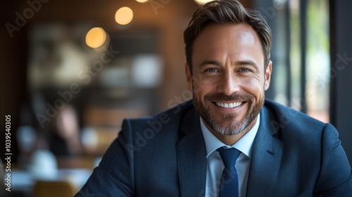 A man in a suit and tie is smiling and looking at the camera. He is confident and happy