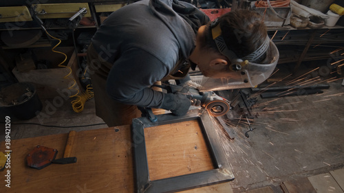 A man in gloves cuts metal with a circular saw, a lot of sparks. The working process