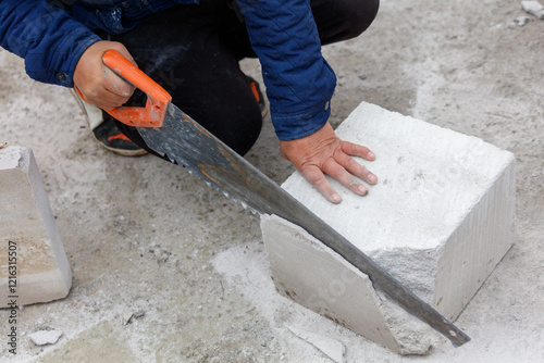 man, cutting, block, concrete, saw, concept, hard, determination, work, construction, task, brick, men at work, hand, builder, cement, bricklayer, industry, material, building, site, stone, manual, mason, equipment, masonry, laying, tool, job, paving, pavement, level, hammer, trowel, road, house, sidewalk, brickwork, wall, installing