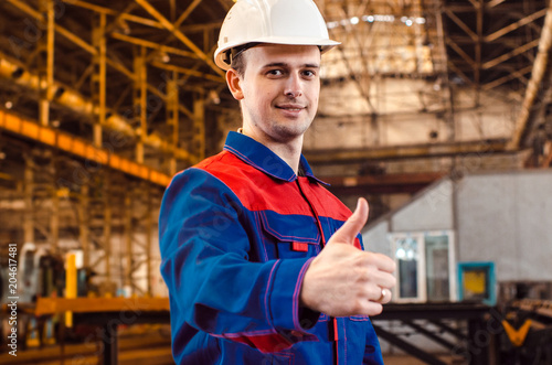 A man is showing his thumb up. An employee in overalls and a white helmet of an industrial plant shows a class. Gestures.
