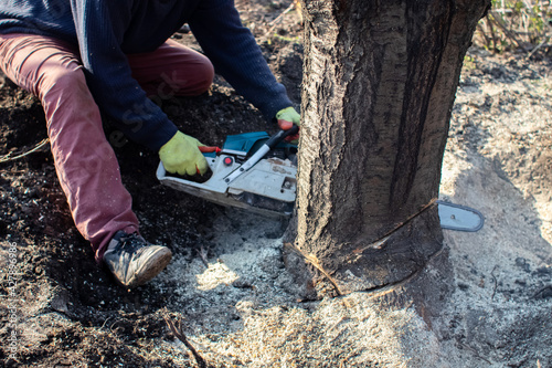 A man lumberjack is sawing a tree with a chainsaw. The sawdust is thrown straight into the screen. Farmer at work. Grubbing old trees. The concept of deforestation and the active work of the industry