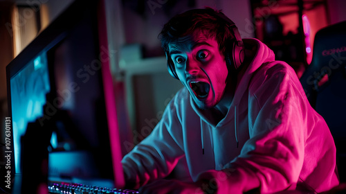 gamer, gaming, computer, headset, screen, keyboard, excited, happy, play, competitive, neon, light, night