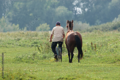 a man rides a bicycle and walks nearby a horse from the pasture.