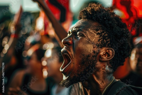 A man shouts passionately during a protest, his expression conveying raw emotion and urgency
