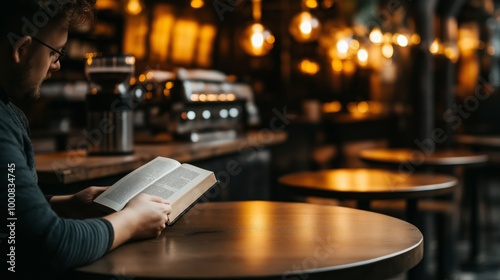 A man sits alone in a cozy café reading a book, surrounded by warm lighting and a quiet, peaceful atmosphere, creating a perfect setting for relaxation and introspection