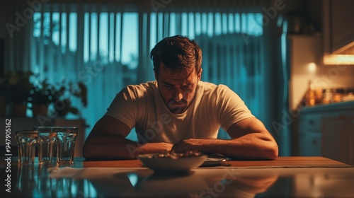 A man sits at a kitchen table in the evening, reflecting thoughtfully with low lighting and shadows highlighting his features