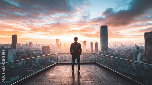 ambition, vision, future, man, standing, bridge, looking, city, skyline, perspective, growth, opportunity, exploration, journey, aspiration, landscape, connection, hope, motivation, atmosphere, depth, dream, scene, oneness, inspiration, light, determination, strength, aesthetic, life events, emotion, adventure, insight, empowerment, transition, community, whimsy, dynamic, clarity, sharpened