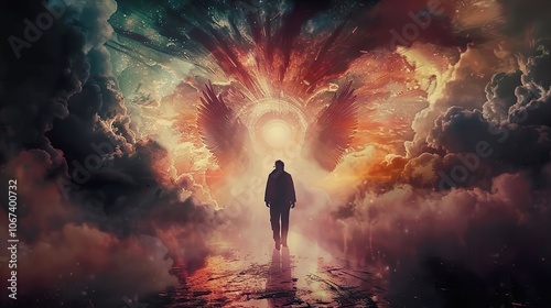 A Man Walks Towards the Heavenly Light, Surrounded by Divine Wings and Celestial Clouds