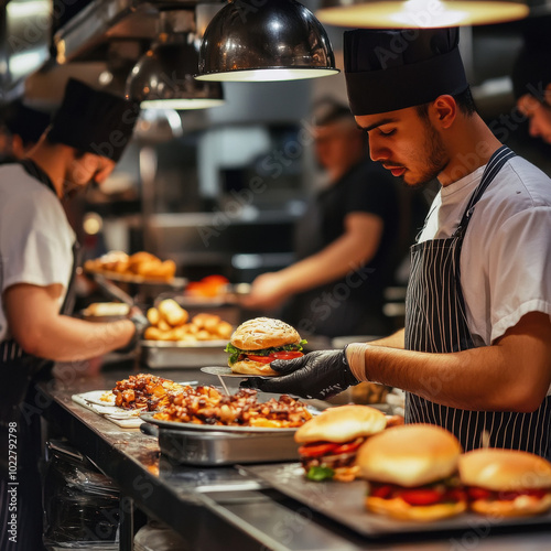 profession, uniform, atmosphere, tied-up, occupation, hotel, working, job, service, standing, indoor, professional, meat, lunch, several, male, wearing, stove, eatery, making, hamburger, people, catering, kitchen, cook, happy, preparing, man, chef, business, cookery, apron, white, young, burger, plate, culinary, adult, bustling, epicure, dish, meal, also, food, fresh, dinner, cookery, delicious