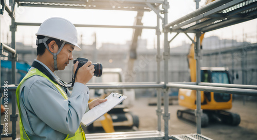 A man wearing a helmet taking pictures at a construction site