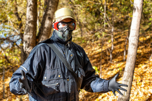 A man wearing a respirator mask and protective glasses in the forest at COVID-19 period.