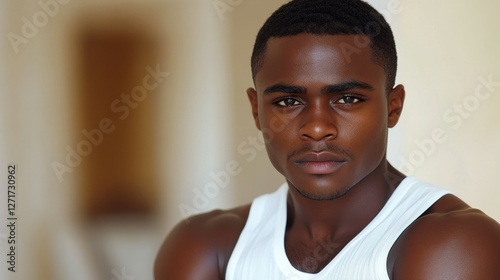man, head, beard, wearing, white, tank, top, look, person, directly, portrait, male, camera, face, young, black, guy, attractive, adult, african, background, isolated, casual attire, studio, serious, photogenic, expression, 1, american, human, closeup, confidence, model, real, happy, eye, natural, fashion, beauty, thoughtful, lifestyle, style, coiffure, cool, head shot, profile, dramatic, business, afro