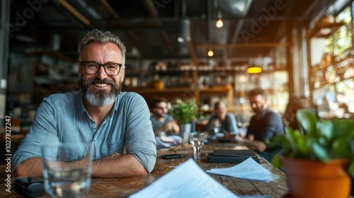 A man with glasses sits engagingly in a cafe, focused on the camera, surrounded by papers and colleagues, creating a cozy and collaborative work environment.